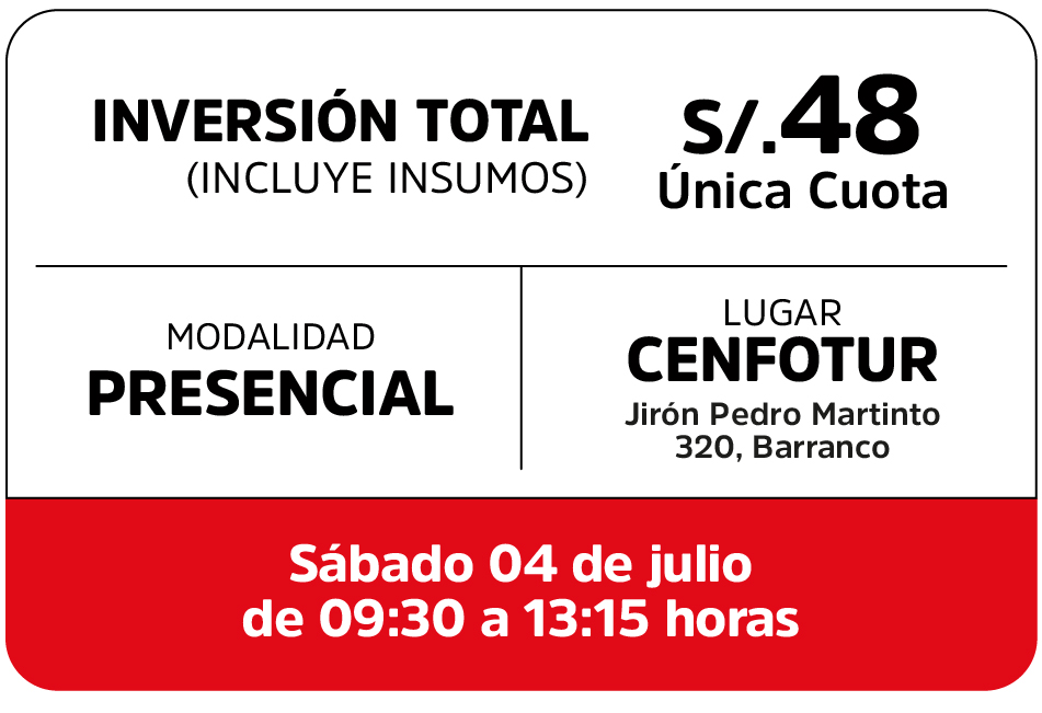 A lo largo del taller, desarrollarás habilidades prácticas en repostería peruana mientras aplicas buenas prácticas de manipulación de alimentos. Ideal para quienes buscan perfeccionar sus conocimientos, emprender o reconectar con la riqueza gastronómica del país.